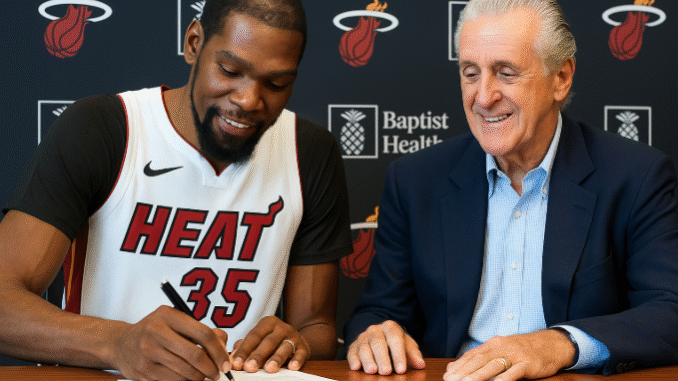Reactions from fans on social media ranged from excitement to disbelief. “KD wearing a Heat uniform?” That’s unbelievable,” a fan wrote on Twitter. “Pat Riley gave a masterclass just now.”